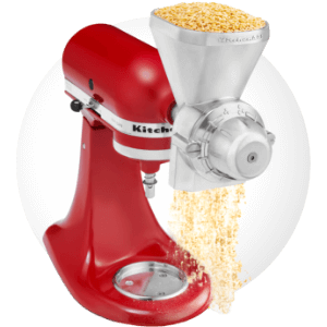 Bevestig de metalen graanmolen op de mixer/keukenrobot en voeg de havermout toe. Stel de molen in op middelgrove maling door aan de instelknop te draaien. Plaats een kom onder de molen, stel de snelheid in op 10 en vang het havermeel op in de kom.