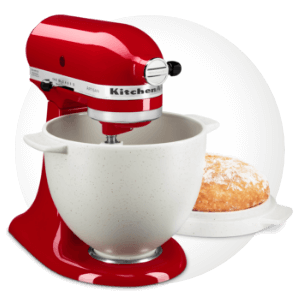 Bereid al je ingrediënten voor op je werkplek. Verwarm de KitchenAid broodkom door deze met heet water te vullen. Giet het water vervolgens af en dep droog. Doe alle ingrediënten in de broodkom. Gebruik een deegspatel of houten lepel en roer de ingrediënten door elkaar tot ze net vochtig zijn. Bevestig de kneedhaak op je KitchenAid Artisan mixer/keukenrobot. Zet de mixer/keukenrobot op snelheid 2. Laat de mixer/keukenrobot de ingrediënten ongeveer een minuut kneden of tot het deeg zich begint te vormen, maar nog nat is. Kneed niet te veel. Neem de kom uit de mixer/keukenrobot, bestrooi de kom en de bovenkant van het deeg royaal met bloem en gebruik je handen (of een deegspatel) om het deeg samen te kneden en in de bloem te wentelen. Strooi nog een beetje bloem over de bovenkant en dek de kom af met het deksel. Laat het deeg 1 tot 1,5 uur rijzen, of tot het dicht bij de bovenste rijslijn is gekomen.